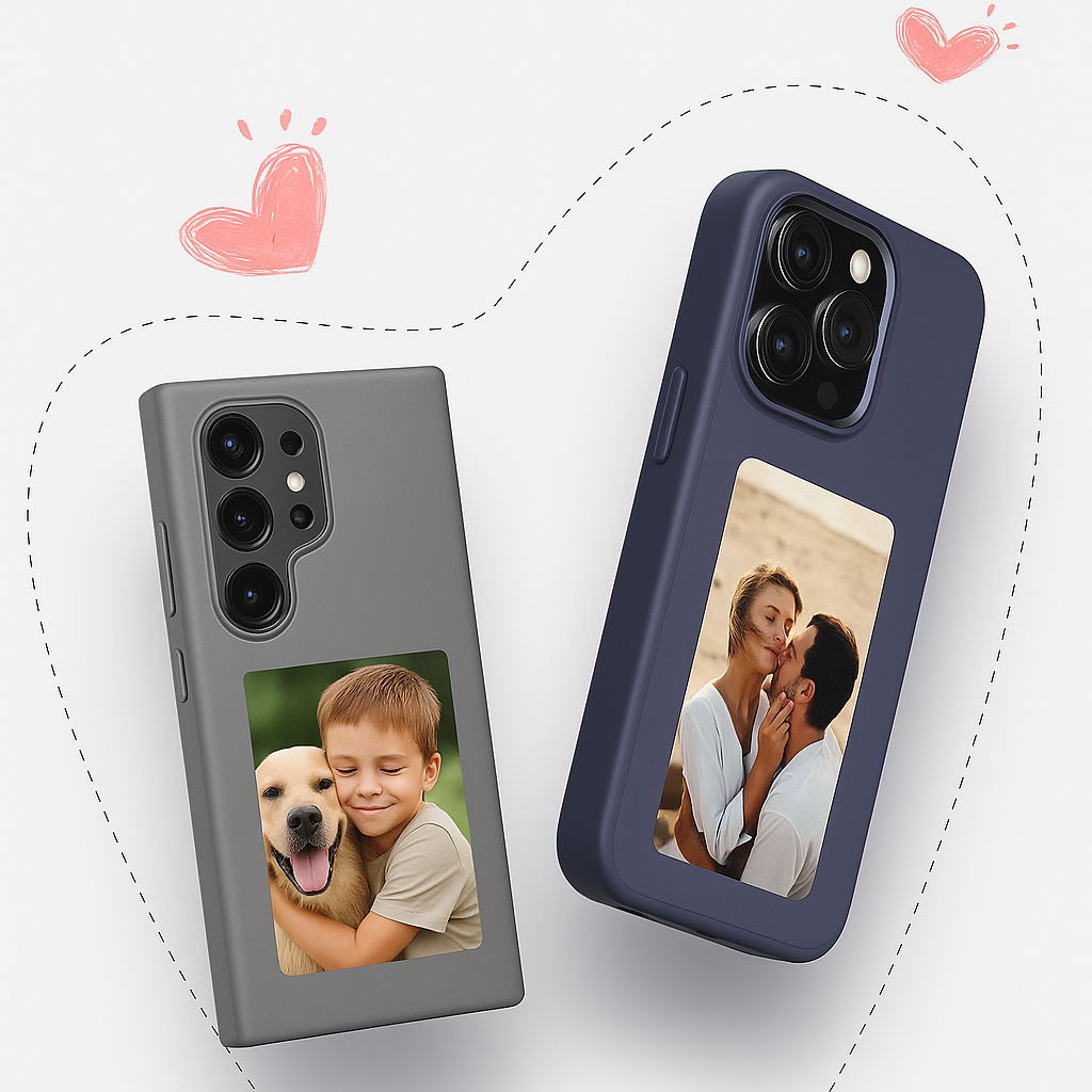 Stecke dein Smartphone in die Hülle, wähle dein Lieblingsmotiv und übertrage es stromlos per NFC auf das E-Ink-Display.