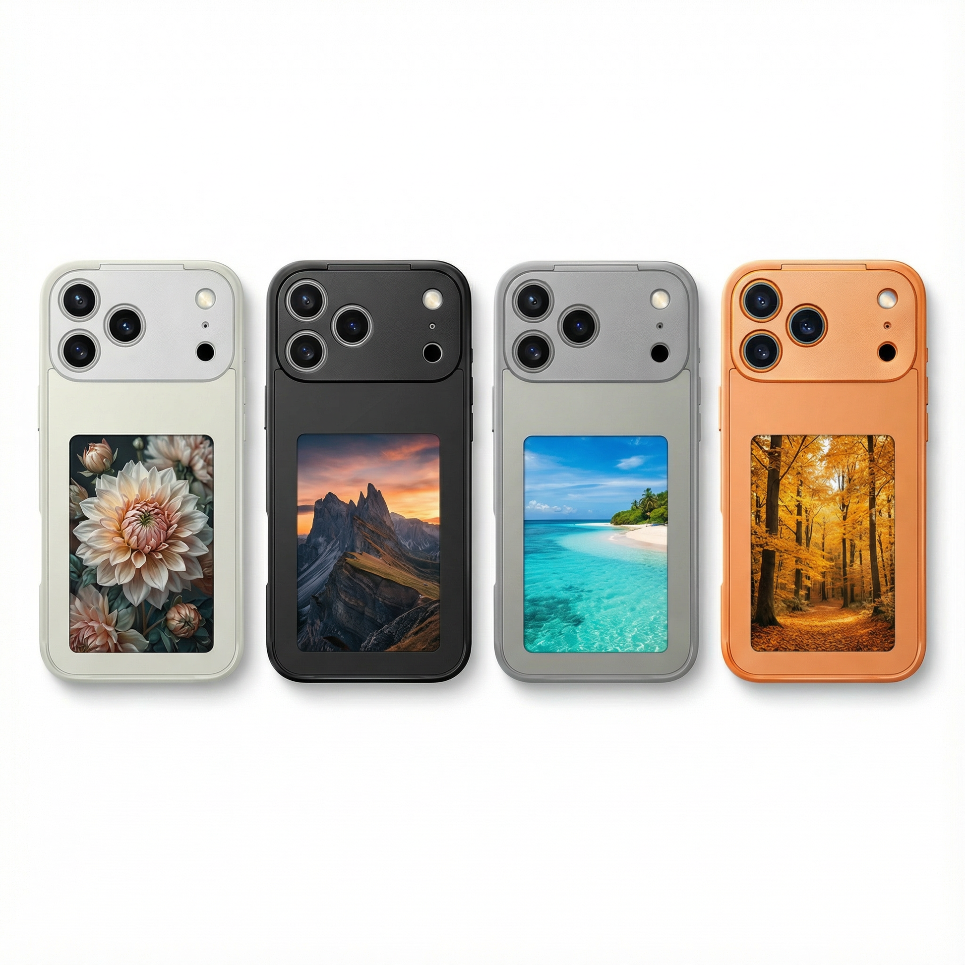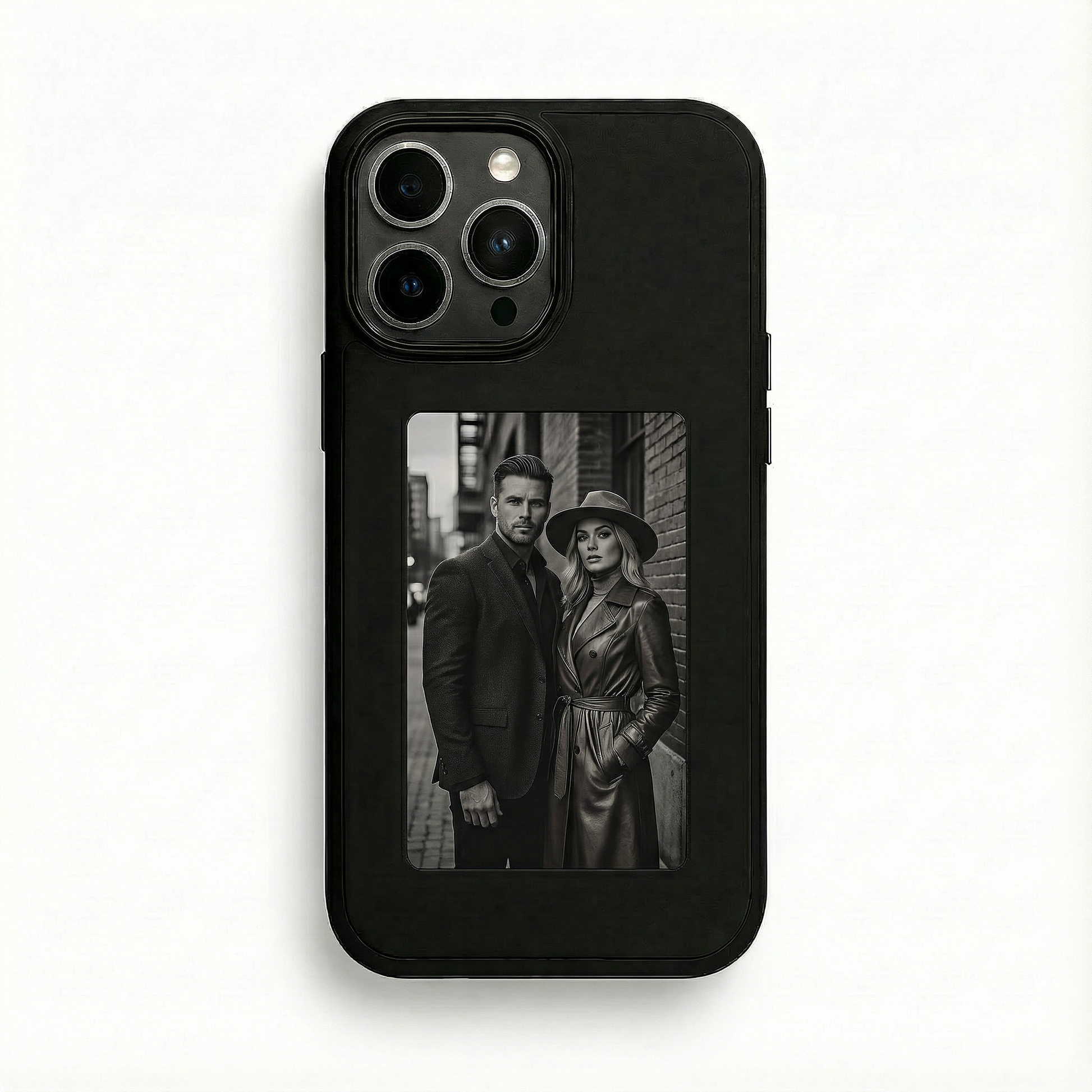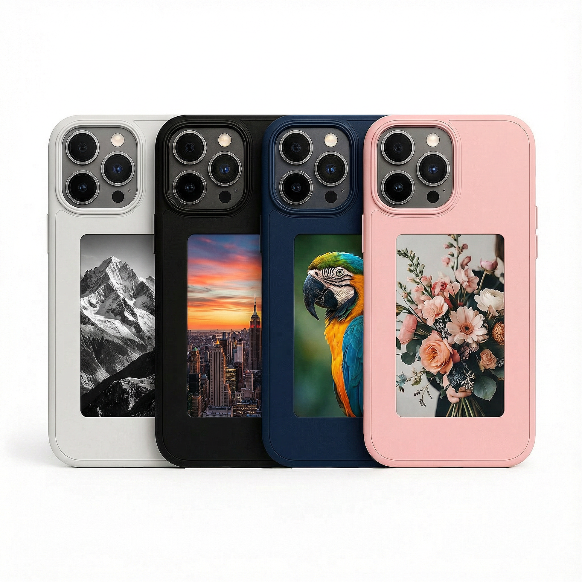 Stecke dein Smartphone in die Hülle, wähle dein Lieblingsmotiv und übertrage es stromlos per NFC auf das E-Ink-Display.